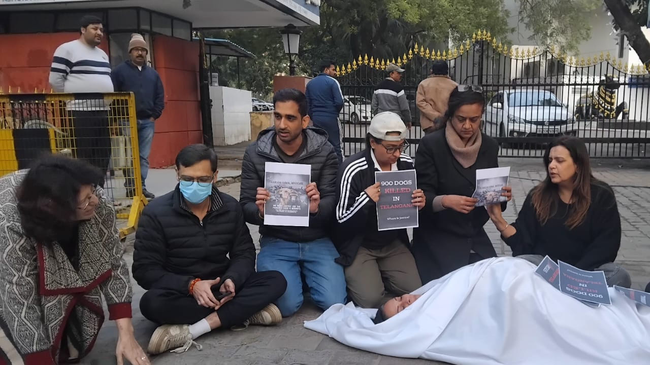 ఢిల్లీ తెలంగాణ భవన్ ఎదుట జంతు ప్రేమికుల ఆందోళన..రోడ్డుపై పడుకుని నిరసన