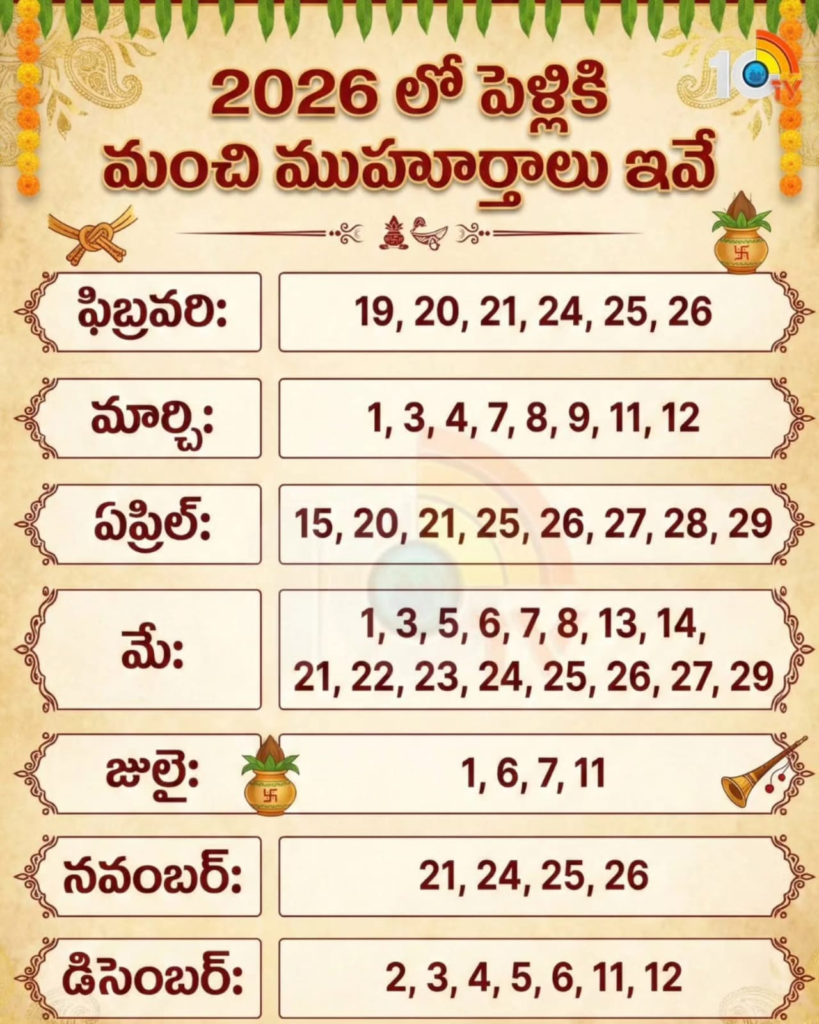 ✅ 2026 పెళ్లి శుభ ముహూర్తాలు (నెలల వారీగా)